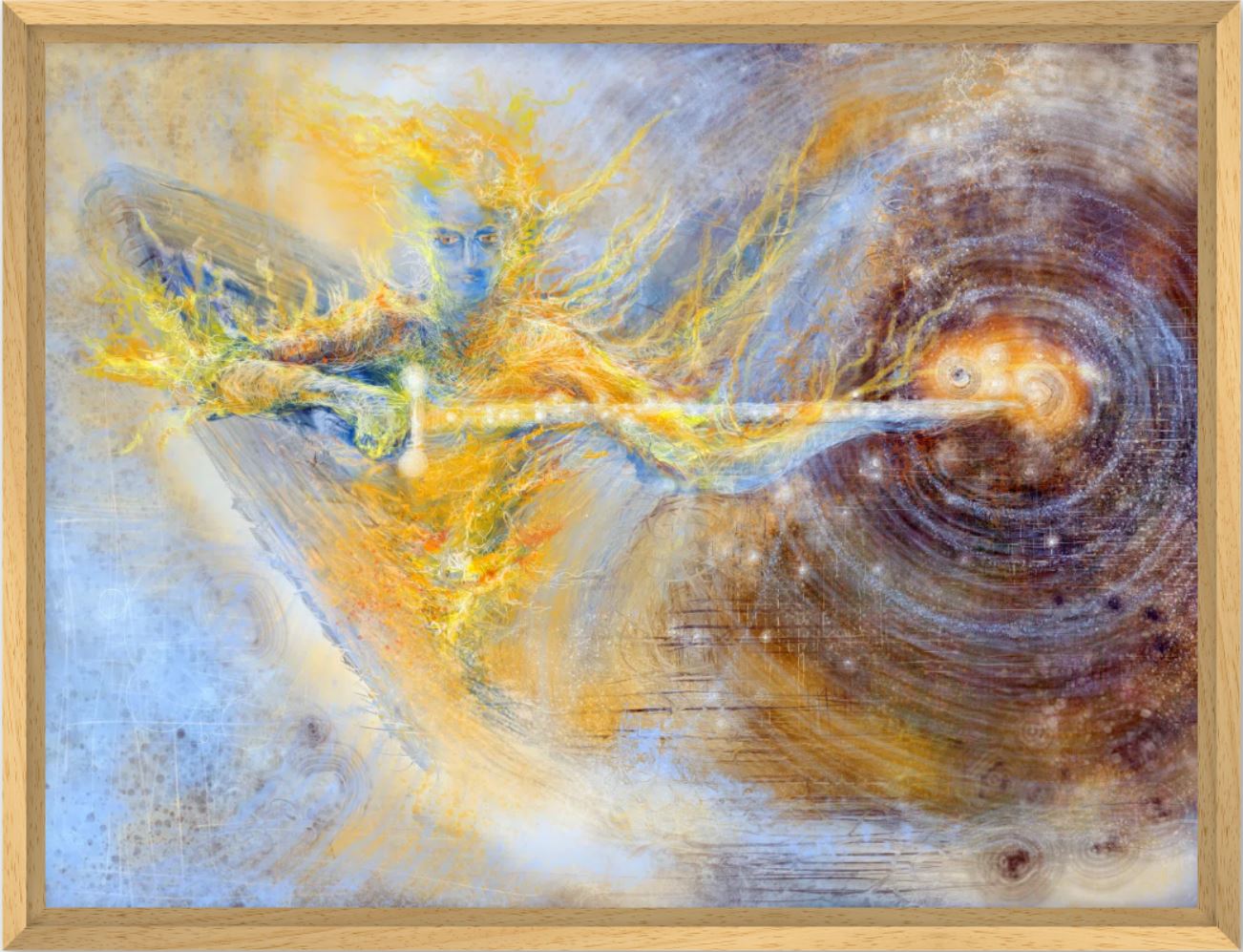 In dit kunstwerk is zijn zwaard zijwaarts gekeerd. Zijn kracht is intens en vlamachtig aanwezig. Met zijn lichtende zwaard doorbreekt hij zware energie en maakt ruimte voor moed en waarheid.
